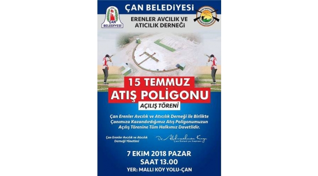 Çan Belediye Başkanı Abdurrahman Kuzu, Çan Belediyesi tarafından tüm maliyetleri karşılanarak Mallı Köy yolu, Şuayip Mevkii’nde yapımı tamamlanan, Uluslararası Trap ve Skeet Atış Poligon’unun, Tüm Avcılar ve Avcılar Derneği üyeleriyle birlikte, pazar günü açılışının yapılacağı müjdesini verdi. Başkan ‘’KUZU’’ yerel, genel ve uluslararası yarışmalara ev sahipliği yapacak olan tesisin ilçemize, tüm avcılarımıza ve dernek üyelerine hayırlı olmasını diledi.