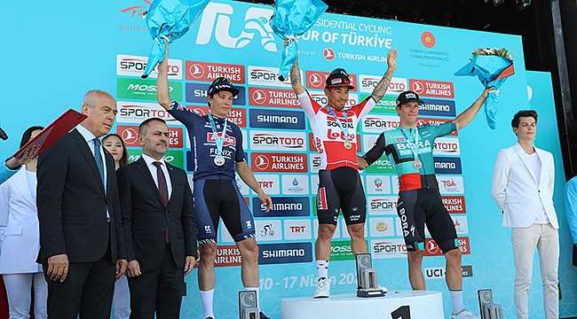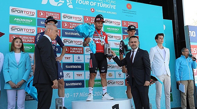 57. Cumhurbaşkanlığı Türkiye Bisiklet Turu Edremit- 57’inci Alay Şehitliği etabının ödül töreninde birinci olan Caleb EWAN’a Vali İlhami AKTAŞ, ikinci olan Danny Van POPPEL’e Cumhurbaşkanı Başdanışmanı Doç. Dr. Mücahit KÜÇÜKYILMAZ ve üçüncü olan Jasper PHİLİPSEN’ e Çanakkale Savaşları Gelibolu Tarihi Alan Başkanı İsmail KAŞDEMİR ödüllerini verdi.