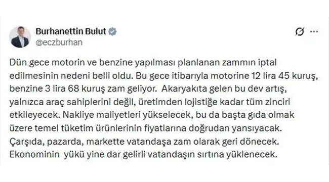 Öte yandan kısa süre önce motorine yapılması planlanan 6,69 liralık zam son anda iptal edilmiş, artış yalnızca gaz yağı ürünlerine uygulanmıştı.