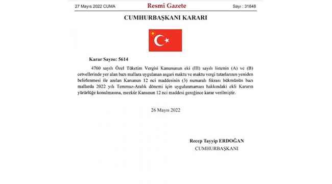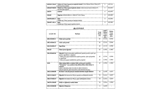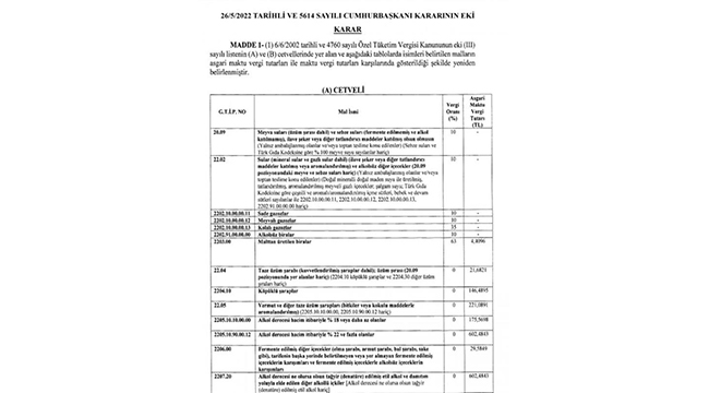 Alkollü içecekler ve sigara ürünlerinde Özel Tüketim Vergisi (ÖTV) oranı artırıldı. Alkollü içeceklerde ÖTV artış oranı yüzde 25 olurken sigarada ÖTV artış oranı yüzde 10 oldu. Karar, Resmi Gazete'de yayınlandı.
