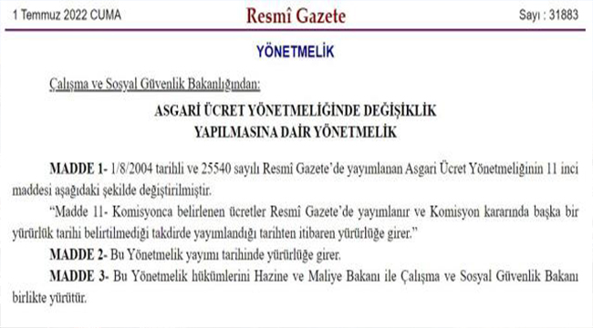 Asgari ücrete yapılacak ara zammın 1 Temmuz'dan itibaren yürürlüğe girebilmesi için gereken yönetmelik Resmi Gazete'de yayımlandı. Kararla birlikte asgari ücretli çalışanlar, zamlı maaşlarını temmuz ayından itibaren alacaklar. Asgari ücretin bugün Cumhurbaşkanı Recep Tayyip Erdoğan tarafından açıklanması bekleniyor.
