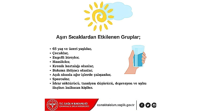 Çanakkale İl Sağlık Müdürlüğü, hava sıcaklıklarının artmasıyla birlikte ortaya çıkabilecek sağlık sorunlarına karşı vatandaşları uyardı.