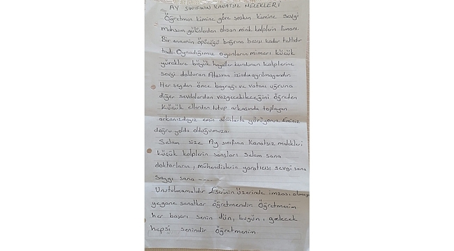 AY SINIFI VELİLERİ KANATSIZ MELEKLERİNE TEŞEKKÜR EDİYOR Dinle Editor: Gazete Çan 23 Kasım 2021 - 17:00 - Güncelleme: 23 Kasım 2021 - 17:18 Çanakkale Atam Kreş velileri öğretmenler günü münasebetiyle kreş öğretmenlerine bir mektup yazarak teşekkür ettiler. Paylaş Tweetle WhatsApp YORUMLAR 0 Yorum adlı kullanıcıya cevap "GELECEĞİ AYDINLATANLAR ÖĞRETMENLERİMİZDİR" ÇOMÜ’DE "MAVİ VATAN BAĞLAMINDA KIBRIS’IN JEOPOLİTİK ÖNEMİ" KONUŞULDU EZİNE’DE MOTOSİKLET SÜRÜCÜLERİNE EĞİTİM EĞİTİME KATKI İÇİN KALEME ALINDI DOLAR, HAFTAYA DÜŞÜŞLE BAŞLADI! "ÇALIŞANLARIMIZI KORUMA POLİTİKAMIZI ASGARİ ÜCRETTE DE SÜRDÜRECEĞİZ"