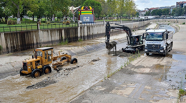 Biga Belediyesi'ne ait iş makineleri Kocabaş Çayının Hacımadan Köprüsü ile Arapdede Köprüsü arasındaki yaklaşık 2,5 kilometrelik alanında temizlik çalışması yapıyor.