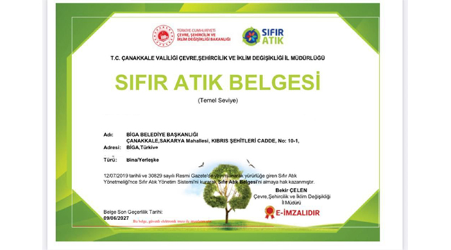 Biga Belediyesi, Çevre, Şehircilik ve İklim Değişikliği Bakanlığının Sıfır Atık Yönetmeliği kapsamında kamu binaları için zorunlu hale getirilen "Temel Seviye Sıfır Atık" belgesini aldı.