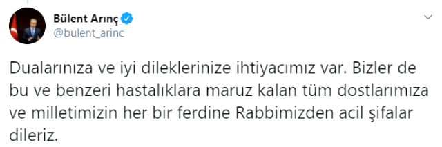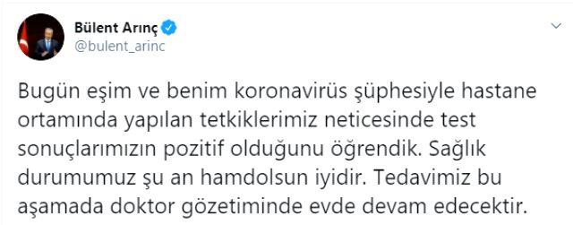 Açıklamayı Twitter hesabından yapan Arınç, şunları yazdı "Bugün eşim ve benim koronavirüs şüphesiyle hastane ortamında yapılan tetkiklerimiz neticesinde test sonuçlarımızın pozitif olduğunu öğrendik. Sağlık durumumuz şu an hamdolsun iyidir. Tedavimiz bu aşamada doktor gözetiminde evde devam edecektir.