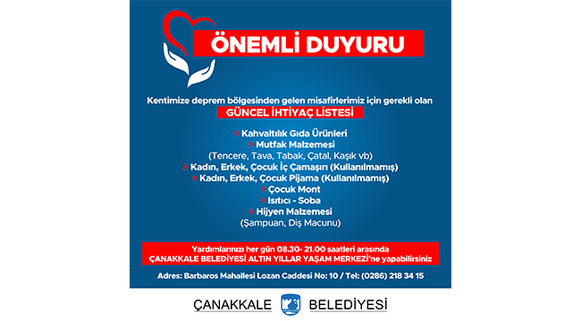 Yardımlarınızı her gün 08.30-21.00 saatleri arasında Çanakkale Belediyesi Altın Yıllar Yaşam Merkezine yapabilirsiniz.