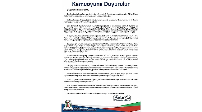 Dolayısıyla Çan Belediyesi olarak, su abonelerimizin faturalarını öteleyerek ekonomik anlamda yanınızda olmaya çalışıyoruz. Bu sebeple konut ve işyerlerine ait su abonelerimizden Nisan - Mayıs - Haziran aylarına ait su faturaları ödemelerini gecikme faizi uygulamaksızın 3 ay erteleme kararını almış bulunuyoruz.