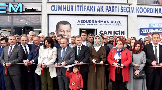 Açılış töreni, öncelikle aziz şehitlerimizin anısına saygı duruşu ve İstiklal Marşı ile başladı. Biz biriz beraberiz ve bu birlikten Çan kazançlı çıkacak diyerek güçlü bir mesaj veren Cumhur ittifakının ortağı MHP Çan İlçe Başkanı Fevzi KARAKAYA’nın konuşmasının ardından AK Parti Çan İlçe Başkanı Orhan ARSLAN da birlik beraberlik mesajı verdi. Ardından AK Parti Çanakkale İl Başkanı Gültekin YILDIZ; “Biz, Başkanımız Abdurrahman KUZU’nun her davetine katılmaya özen gösteriyoruz ve her zaman yanındayız, destekçisiyiz.” dedi. Cumhur İttifakı AK Parti Çan Belediye Başkan Adayı Abdurrahman KUZU; “Ülkemizin bekası için Cumhur ittifakından gurur duyuyoruz. Cumhur ittifakı masada değil, milletin talebiyle 15 Temmuzda bu vatanın bekası için oluşmuş bir ittifak. 31 Martta inşallah bu ittifakın zaferini hep birlikte yaşayacağız.” Dedi. 10 Yıllık hizmetlerinden hızlıca bahseden Başkan KUZU adeta hafızaları diriltti. Başkan KUZU, konuşmasını gelecek dönemdeki 60 projesi ve OSB ile Büyük Meydan Projesini de anlatarak bitirdi. Sıkça yapılan tezahürat ve alkışlarla kalabalığın coşkusu daha da arttı. AK Parti Çanakkale Milletvekili Jülide İSKENDEROĞLU ise “Yaparsa Abdurrahman KUZU yapar” ifadelerine vurgu yaptı. Son olarak AK Parti Grup Başkan Vekili ve Çanakkale Milletvekili Bülent TURAN “Bizim Ankara’da iş yapmamızı sağlayan bir Başkanımız var” diyerek dikkatleri toplandı.