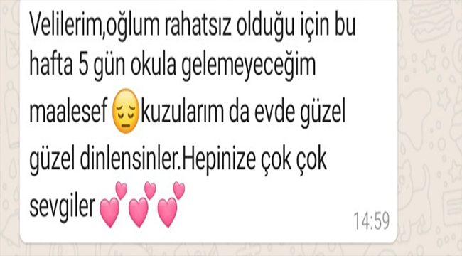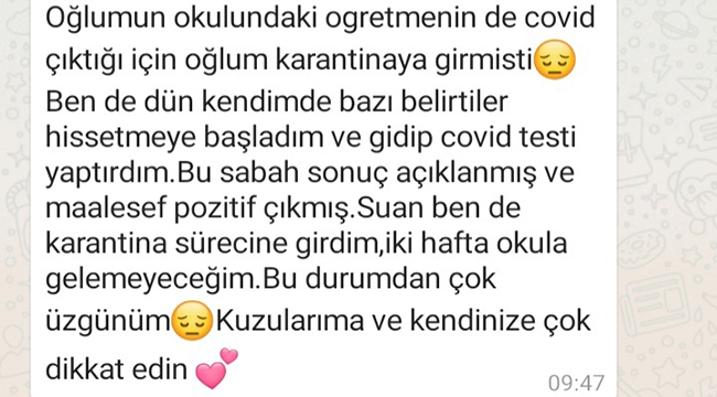 Edinilen bilgiye göre, Çan’ın Etili Köyü’nde bir anasınıfı öğretmeni Covid testi pozitif çıkar çıkmaz velileri mesajla bilgilendirdi. İl Sağlık Müdürlüğü anasınıfı öğrencilerinin velileri ile irtibata geçerek öğrencileri ve velileri filyasyona aldı. Oğlu Çan’da özel bir kreşe giden öğretmen kreşte Covid vakası görülmesi üzerine, velilere ilk gönderdiği mesajında “Velilerim, oğlum rahatsız olduğu için bu hafta 5 gün okula gelemeyeceğim maalesef, kuzularımda evde güzel güzel dinlensinler. Hepinize çok çok sevgiler” dedi. Ardından kendisi de test yaptırarak ikinci mesajı gönderdi; “Oğlumun okuldaki öğretmenin de Covid çıktığı için oğlum karantinaya girmişti. Ben de dün kendimde bazı belirtiler hissetmeye başladım. Bu sabah sonuç açıklanmış ve maalesef pozitif çıkmış. Şu an ben de karantina sürecine girdim, iki hafta okula gelemeyeceğim. Bu durumdan çok üzgünüm, kuzularıma ve kendinize çok dikkat edin” dedi.
