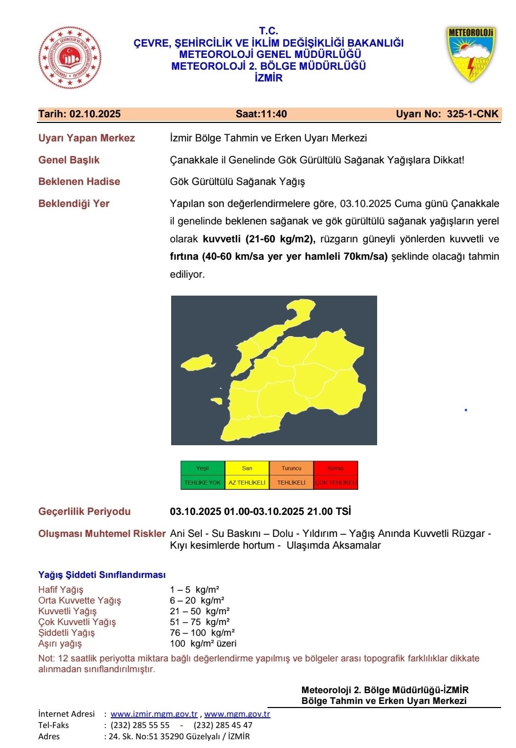 Çanakkale Valiliği, 03 Ekim 2025 Cuma günü il genelinde gök gürültülü sağanak yağışların beklendiğini duyurdu.