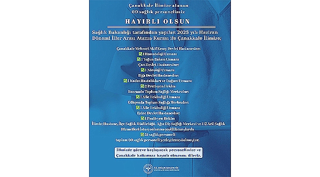Sağlık Bakanlığı tarafından gerçekleştirilen 2025 yılı Haziran Dönemi İller Arası Atama Kurası kapsamında, Çanakkale iline toplam 60 sağlık personeli yerleştirildi.