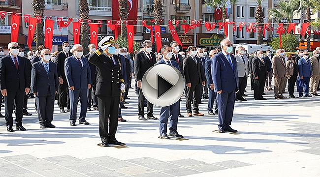 Cumhuriyet Meydanı’nda düzenlenen törende; Vali İlhami AKTAŞ, Boğaz ve Garnizon Komutanı Tuğamiral Mehmet Cem Okyay ve Çanakkale İli Merkez İlçe Belediye Başkanı Ülgür Gökhan tarafından Atatürk Anıtı’na çelenk sunuldu.