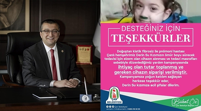Çan'da yaşayan ve doğuştan kistik fibrosiz ile pnömani hastası olan Derin Su'nun tedavisi için Çan Belediye başkanı Bülent Öz, yardım kampanyası başlatmıştı.