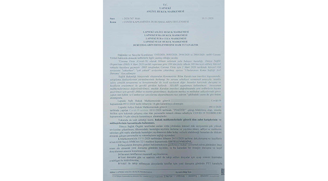 Resmi yazıda, “Mahkememizin, 11/11/2020 tarihinden itibaren 24/11/2020 tarihine dek, duruşma ve keşiflerin re’sen 6100 sayılı HMK’nın 32/1 maddesi kapsamında ertelenmesine” ifadeleri kullanıldı.