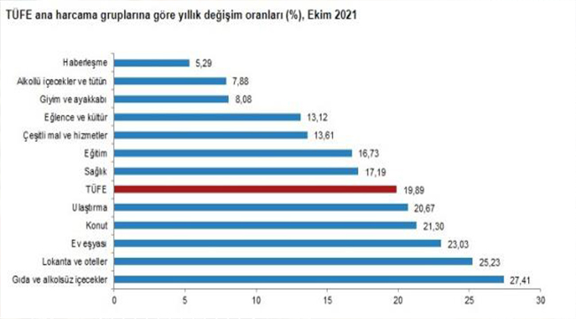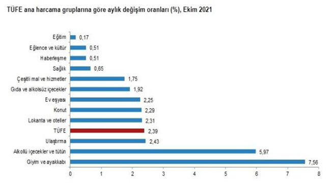 Ana harcama grupları itibarıyla 2021 yılı Ekim ayında en az artış gösteren ana gruplar %0,17 ile eğitim, %0,51 ile eğlence ve kültür ile haber leşme oldu. Buna karşılık, 2021 yılı Ekim ayında artışın yüksek olduğu gruplar ise sırasıyla, %7,56 ile giyim ve ayakkabı, %5,97 ile alkollü içecekler ve tütün ve %2,43 ile ulaştırma oldu.