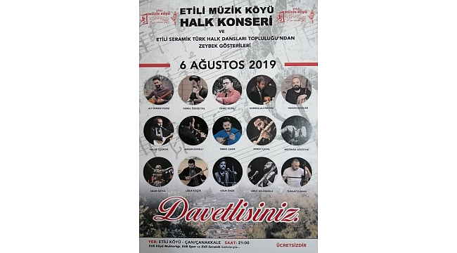 Etili Köyü Muhtarlığı, Etili Spor ve Etili Seramik’in katkılarıyla organize edilen, Etili Müzik Köyü Halk Konseri ve Zeybek gösterileri 6 Ağustos Salı günü saat 21.00’da Etili Köyünde gerçekleştirilecektir.