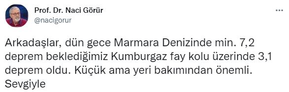 Bu sarsıntı ile ilgili Prof. Dr. Naci Görür, “Arkadaşlar, dün gece Marmara Denizi’nde minimum 7,2 deprem beklediğimiz Kumburgaz fay kolu üzerinde 3,1 deprem oldu. Küçük ama yeri bakımından önemli” paylaşımında bulundu.