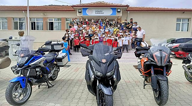 Gökköy İlkokuluna kitap bağışında bulunmak için giden 10Riders üyeleri, öğrenciler tarafından okul bahçesinde bayraklarla karşılandı.