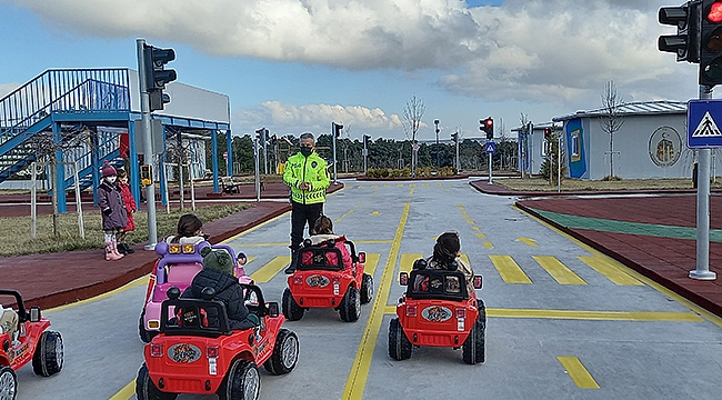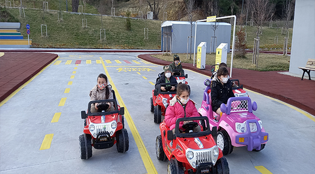 Öğrenciler, Trafik Eğitim Parkı’nda ışıklı-ışıksız kavşaklar, yaya geçitleri, üst geçit, trafik levhaları ile trafik kurallarını uygulamalı olarak öğrendi.