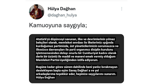 Eski Memleket Partisi İl Başkanı Hülya Dağhan, sosyal medya hesabından istifası ile ilgili yapmış olduğu paylaşımda “Atatürk’çü düşünceyi savunan, ilke ve devrimlerinin yılmaz bekçileri olarak, memleket sevdası ile ilkelerimiz ışığında kurduğumuz partimizde, üst yöneticilerimizin sorumsuzca ve ilkesizce davranışları ile parti organımız disiplin kurulunu işletmemesinden dolayı onurlu bir Cumhuriyet kadını olarak derin bir üzüntü ile maddi ve manevi emek vermiş olduğum Memleket Partisi üyeliğimden istifa ediyorum.