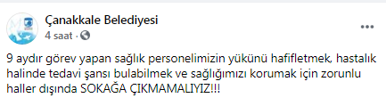 Çanakkale Belediyesi tarafından, yapılan sosyal medya paylaşımında, sokağa çıkılmaması gerektiği belirtildi. Paylaşımda, “9 aydır görev yapan sağlık personelimizin yükünü hafifletmek, hastalık halinde tedavi şansı bulabilmek ve sağlığımızı korumak için zorunlu haller dışında sokağa çıkmamalıyız!” ifadeleri kullanıldı.