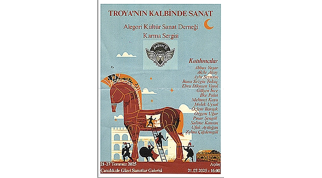 Alegori Kültür Sanat Derneği tarafından Çanakkale Belediyesi destekleri ile düzenlenen “Troya’nın Kalbinde Sanat” isimli karma sergi, 21-27 Temmuz 2025 tarihleri arasında Çanakkale Güzel Sanatlar Galerisi’nde ziyarete açık olacak.
