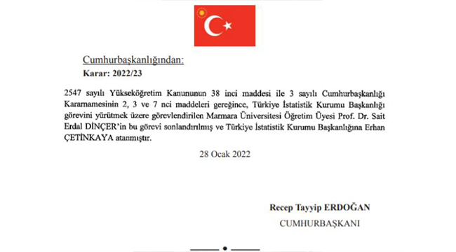 Cumhurbaşkanı Recep Tayyip Erdoğan'ın imzasıyla Resmi Gazete'de yayımlanan kararda "2547 sayılı Yükseköğretim Kanununun 38'inci maddesiyle 3 sayılı Cumhurbaşkanlığı kararnamesinin 2, 3 ve 7'nci maddeleri gereğince, Türkiye İstatistik Kurumu Başkanlığı görevini yürütmek üzere görevlendirilen Marmara Üniversitesi Öğretim Üyesi Prof. Dr. Sait Erdal Dinçer'in bu görevi sonlandırılmış ve Türkiye İstatistik Kurumu Başkanlığına Erhan Çetinkaya atanmıştır" denildi.