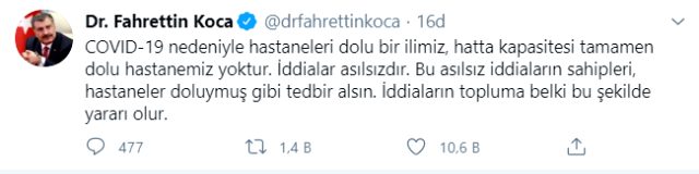 Bakan Koca'nın Twitter'dan yaptığı açıklama şu şekilde;"COVID-19 nedeniyle hastaneleri dolu bir ilimiz, hatta kapasitesi tamamen dolu hastanemiz yoktur. İddialar asılsızdır. Bu asılsız iddiaların sahipleri, hastaneler doluymuş gibi tedbir alsın. İddiaların topluma belki bu şekilde yararı olur."