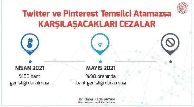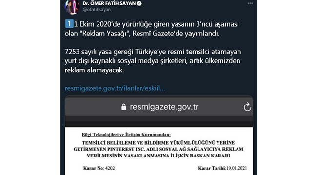 Resmi Gazete'de yayımlanan kararla, Türkiye'ye temsilci atamayan sosyal medya ağlarının Türkiye'den reklam alması durduruldu. Yayımlanan kararla, Türkiye'de milyonlarca kullanıcısı bulunan Twitter, Periscope ve Pinterest gibi sosyal medya devlerinin Türkiye'den reklam alması yasaklandı.