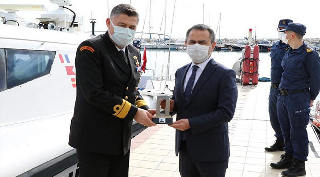 Sahil Güvenlik Ege Deniz Bölge Komutanı Tuğamiral Serkan TEZEL, Küçükkuyu Sahil Güvenlik Karakol Komutanı SG. Kd. Yüzbaşı Ahmet YAKIN ve personeline çalışmalarında başarılar dileyerek teşekkür eden Vali İlhami AKTAŞ, Sahil Güvenlik Ege Deniz Bölge Komutanı Tuğamiral Serkan TEZEL’e günün anısına minyatür Şehitler Abidesi hediye etti.