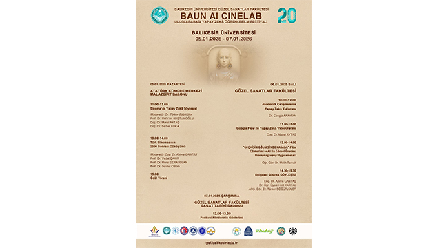 Balıkesir Üniversitesi Güzel Sanatlar Fakültesi ev sahipliğinde düzenlenen BAUN AI CINELAB – Uluslararası Yapay Zekâ Öğrenci Film Festivali, 05–07 Ocak 2026 tarihleri arasında Balıkesir’de gerçekleştiriliyor.