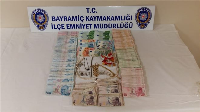 Bayramiç ilçesinde kendisini komiser Alparslan D. olarak tanıtan bir kişi, ev hanımı Cahide Ş´yi (62) arayarak, ‘Adınız FETÖ suç örgütüne karıştı. Evde bulunan para ve ziynet eşyalarını buzdolabının içersine koy. Eve polis göndereceğim ve parola olarak bayrak kelimesini söylediğinde kapıyı aç´ talimatını verdi. Daha sonra kadının evine gelen zanlı, buzdolabından para ve ziynet eşyalarını alarak kaçtı. Bu durumdan şüphelenen kadın durumu Bayramiç İlçe Emniyet Müdürlüğü ekiplerine bildirdi. Gerçek adı Durdu Mehmet Aslan (37) olan zanlı Bayramiç otogarında Çanakkale otobüsüne binmek üzereyken yakalandı. Zanlının yanında Cahide Ş´ye ait 13 bin 25 TL, 725 euro, 9 adet çeyrek altın, 1 adet pul altın, 1 adet inci kolye,1 adet sarırenkli bileklik, 3 adet taşlı, 1 adet taşsız yüzük, 1 adet iç içe geçmiş halka, 1 adet 5 taşlı yüzük, 1 adet 7 taşlı yüzük, 1 adet desenli yüzük, 1 adet gümüş taşlı bileklik ve 1 adet bayan kol saati ele geçirildi.